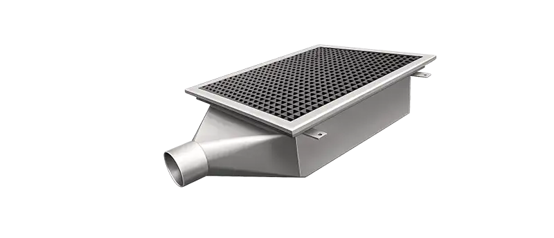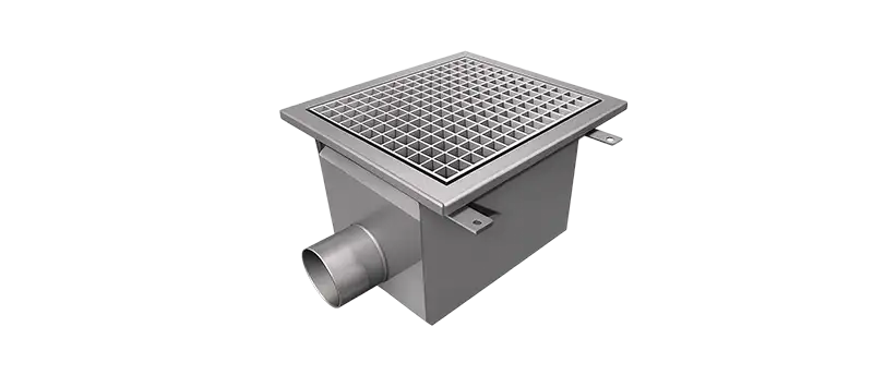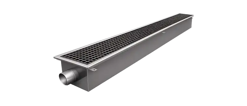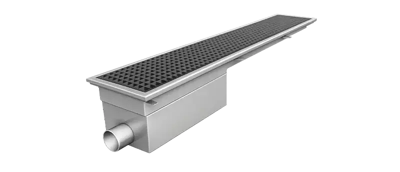 Stor golvränna utrustad med vattenlås och körbart galler för lätt lastbil i varmförzinkat material som standard. Kan fås i alla längder och bredder.